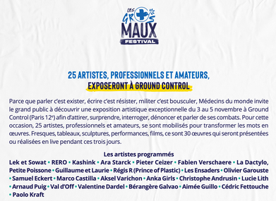Médecins du Monde launches the Festival des Gros Maux, at Ground Control in Paris. A free urban art festival, open to all and committed to denouncing the ills of our society. Each of the artists present at the festival chose to offer one of their works to Médecins du Monde, which will be exhibited during the Festival des Gros Maux and then sold at auction for the benefit of the association.