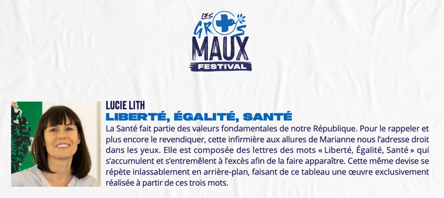 Lucie Lith is participating in this event and has specially created a work for the occasion. She has chose to divert a symbolic figure that is Marianne and to represent a nurse exclusively composed of the words of the motto “Liberty, Equality, Health” in order to shout loudly the importance of this last value as the foundation of our Republic.